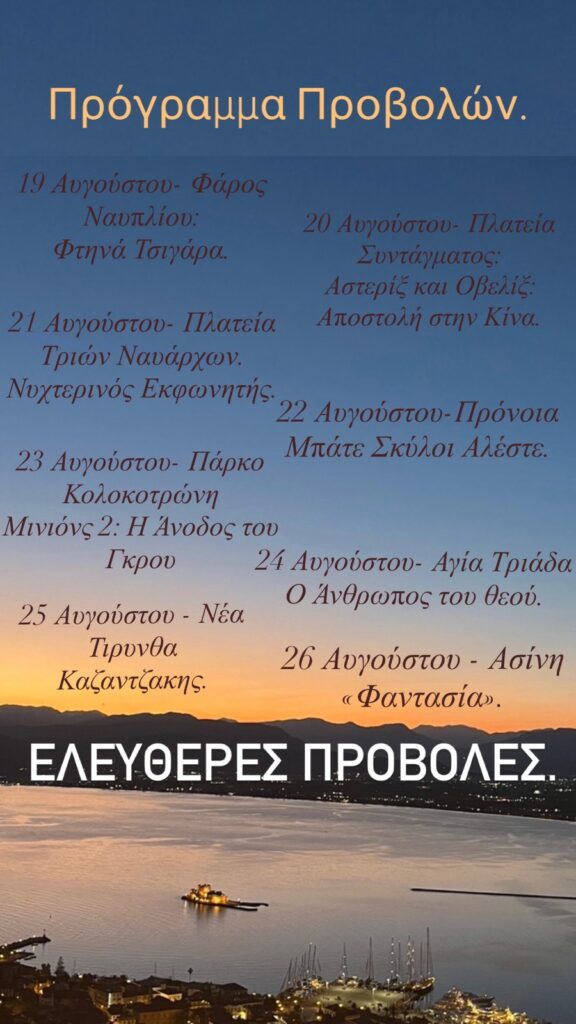 To Φεστιβάλ Θερινού Κινηματογράφου “Cinema Nafplia”, από τις 19 έως τις 26 Αυγούστου 2025, κάτω από τον έναστρο ουρανό της ιστορικής πόλης του Ναυπλίου.