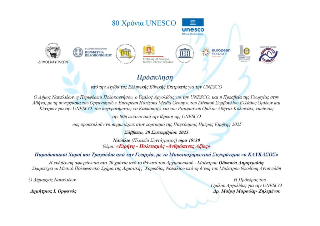 Με κεντρικό θέμα «Ειρήνη – Πολιτισμός – Ανθρώπινες Αξίες», ο Δήμος Ναυπλιέων φιλοξενεί ένα ανεπανάληπτο καλλιτεχνικό πρόγραμμα που ενώνει λαούς και πολιτισμούς. Το κοινό θα απολαύσει παραδοσιακούς χορούς και τραγούδια από τη Γεωργία, από το διεθνούς φήμης Μουσικοχορευτικό Συγκρότημα «ΚΑΥΚΑΣΟΣ».