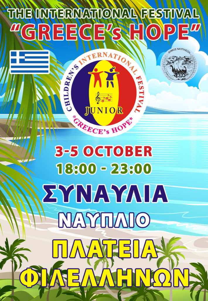 Ο Δήμος Ναυπλιέων ανακοινώνει με ιδιαίτερη χαρά τη διοργάνωση του Διεθνούς Διαγωνισμού «Greece’s Hope», ο οποίος πραγματοποιείται με επιτυχία για 6η συνεχή χρονιά, υπό την αιγίδα του Δήμου.