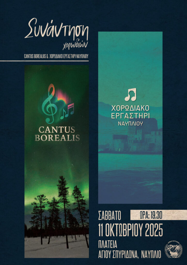 Το Σάββατο 11 Οκτωβρίου 2025, στις 7:30 μ.μ., στην πλατεία του Αγίου Σπυρίδωνα στο Ναύπλιο, ο Πολιτιστικός Σύλλογος “Χορωδιακό Εργαστήρι Ναυπλίου”, με την υποστήριξη του Δήμου Ναυπλιέων, διοργανώνει μια ξεχωριστή Μουσική Συνάντηση δύο χορωδιών.