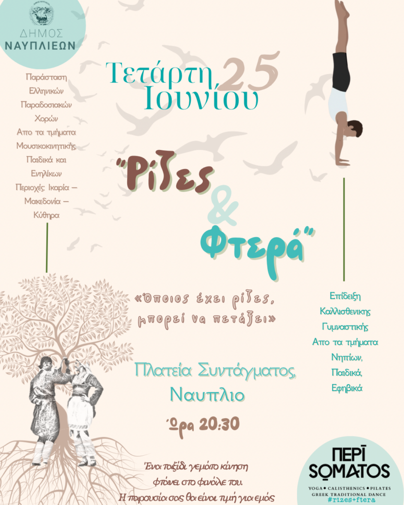 Ο Δήμος Ναυπλιέων σε συνεργασία με τη σχολή Περί Σώματος διοργανώνουν την Τετάρτη 25 Ιουνίου 2025 και ώρα 20:30 στην Πλατεία Συντάγματος, μια ξεχωριστή καλοκαιρινή εκδήλωση με τίτλο «Ρίζες & Φτερά», αφιερωμένη στην ελληνική παράδοση και τη σύγχρονη σωματική έκφραση.