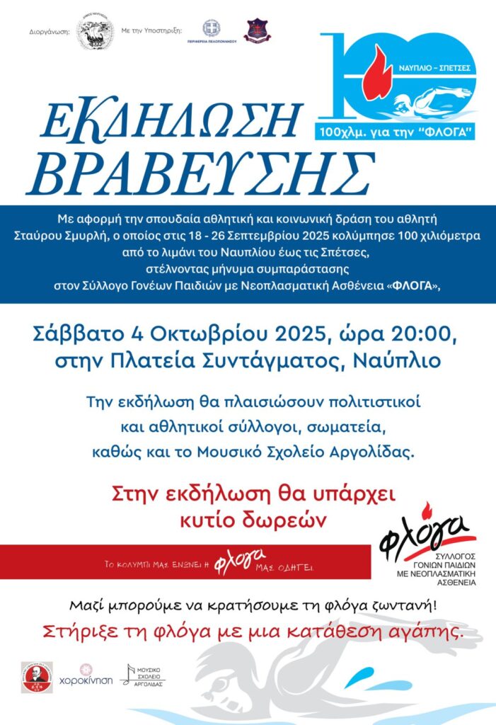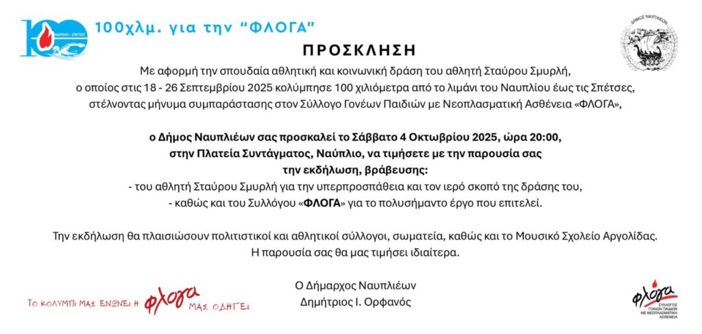 Με αφορμή τον μοναδικό άθλο του αθλητή και υπαλλήλου του Δήμου, Σταύρου Σμυρλή, ο οποίος κολύμπησε 100 χιλιόμετρα μέχρι τις Σπέτσες, με στόχο να στείλει ένα ηχηρό μήνυμα συμπαράστασης στα παιδιά που δίνουν τη δική τους δύσκολη μάχη με σοβαρές ασθένειες, αλλά και στις οικογένειές τους που στηρίζει με συνέπεια και ανιδιοτέλεια ο Σύλλογος «ΦΛΟΓΑ», ο Δήμος Ναυπλιέων αποδίδει την οφειλόμενη τιμή.