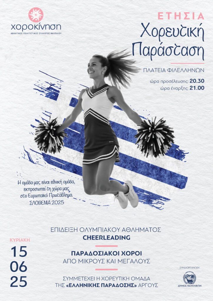 Ο Αθλητικός Πολιτιστικός Σύλλογος Ναυπλίου «ΧΟΡΟΚΙΝΗΣΗ», σε συνδιοργάνωση με τον Δήμο Ναυπλιέων, παρουσιάζει  την ετήσια χορευτική του παράσταση, την Κυριακή 15 Ιουνίου 2025, στις 21:00, στην πλατεία Φιλελλήνων, προσκαλώντας μικρούς και μεγάλους σε μια βραδιά γεμάτη ρυθμό, δημιουργία και παράδοση.