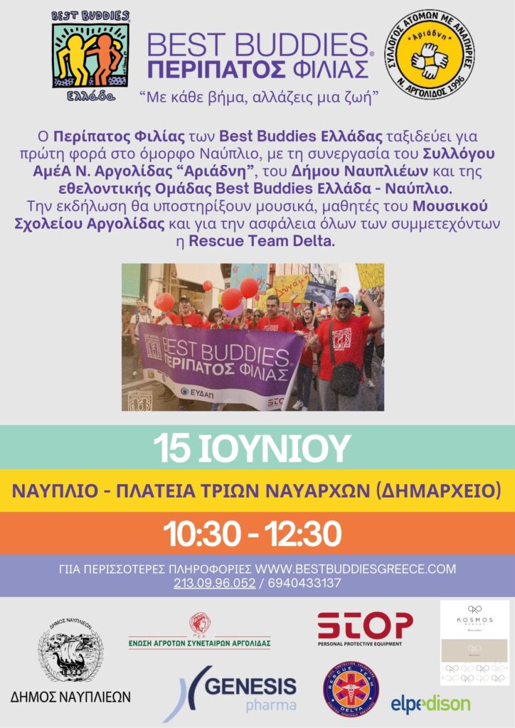 Ο «ΠΕΡΙΠΑΤΟΣ ΦΙΛΙΑΣ», η μεγαλύτερη γιορτή αγάπης, φιλίας και αποδοχής ατόμων με νοητικές ή και άλλες αναπτυξιακές δυσκολίες, διοργανώνεται φέτος για 1η χρονιά στο Ναύπλιο! Η εκδήλωση πραγματοποιείται την Κυριακή 15 Ιουνίου 2025, στις 10:30 π.μ., με σημείο εκκίνησης την Πλατεία Τριών Ναυάρχων, από τα Φιλαράκια Ελλάδας – Best Buddies Greece, σε συνεργασία με τον Σύλλογο ΑμεΑ Ν. Αργολίδας «Αριάδνη» και υπό την αιγίδα του Δήμου Ναυπλιέων.