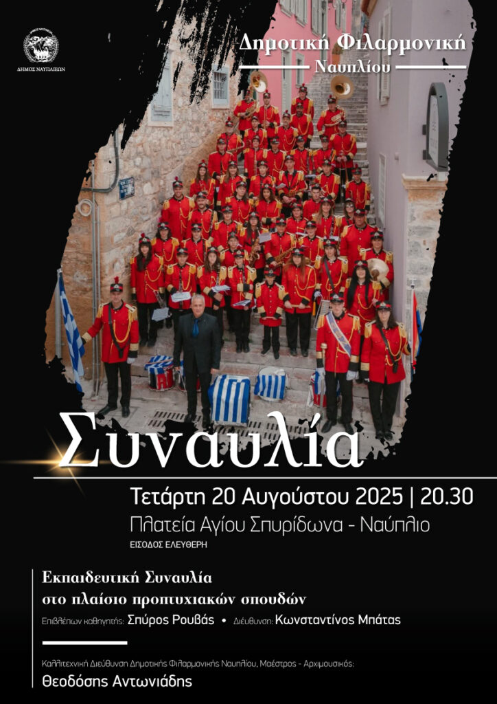 Στην πλατεία Αγίου Σπυρίδωνα την Τετάρτη 20 Αυγούστου 2025 και ώρα 20.30 θα διεξαχθεί συναυλία της Δημοτικής Φιλαρμονικής Ναυπλίου υπό την καλλιτεχνική διεύθυνση του μαέστρου – αρχιμουσικού Θεοδόση Αντωνιάδη