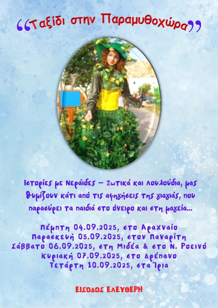 Ο Δήμος Ναυπλιέων, με στόχο την ενίσχυση της πολιτιστικής παιδείας και της δημιουργικής ψυχαγωγίας των παιδιών, προγραμματίζει την παρουσίαση της ξεχωριστής θεατρικής παράστασης «Ταξίδι στην Παραμυθοχώρα».