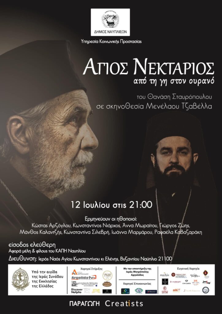 Ο Δήμος Ναυπλιέων, με αίσθημα σεβασμού προς την Ορθόδοξη πίστη και την πολιτιστική μας κληρονομιά, προσφέρει στα μέλη και τους φίλους του ΚΑΠΗ μια σπουδαία θεατρική εμπειρία: την παράσταση «Άγιος Νεκτάριος: Από τη Γη στον Ουρανό», την Τετάρτη 12 Ιουλίου 2025, στις 21:00, στον προαύλιο χώρο του Ιερού Ναού Αγίων Κωνσταντίνου και Ελένης, στον Συνοικισμό Ναυπλίου.
